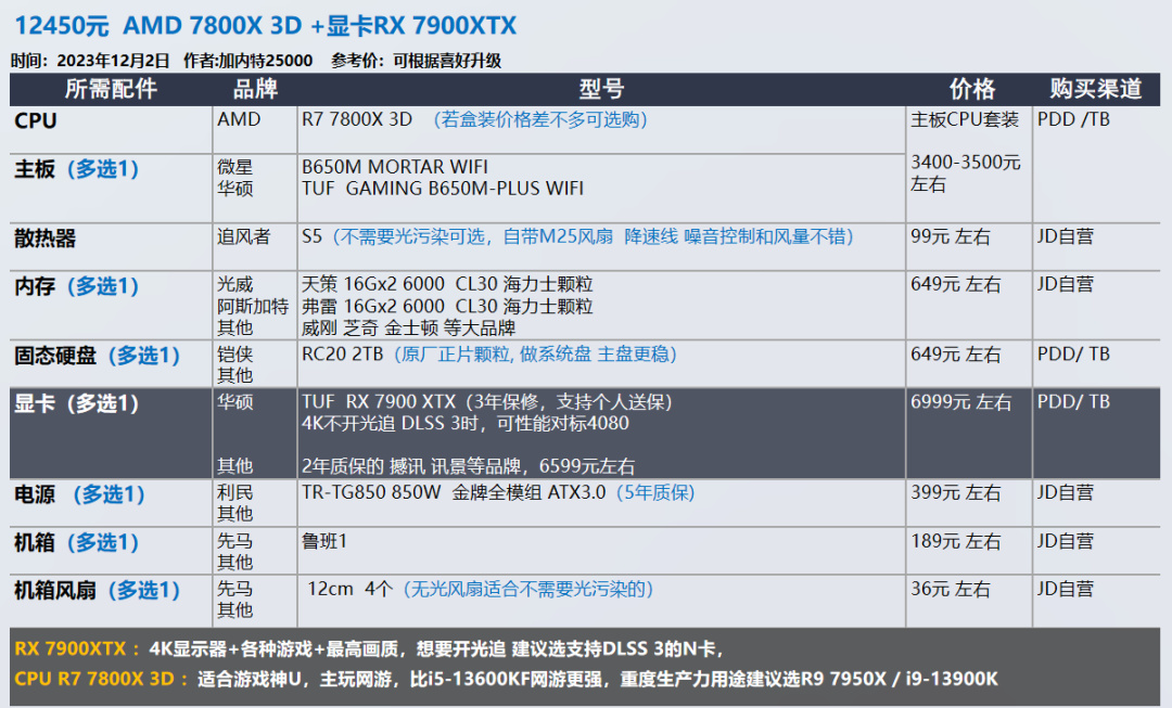 显卡RTX 4070Ti RX7900XTX 配置方案,这2张显卡12月市场价5500-6999左右,4K显示器,不追求画质全拉满,可以流畅大部分游戏。