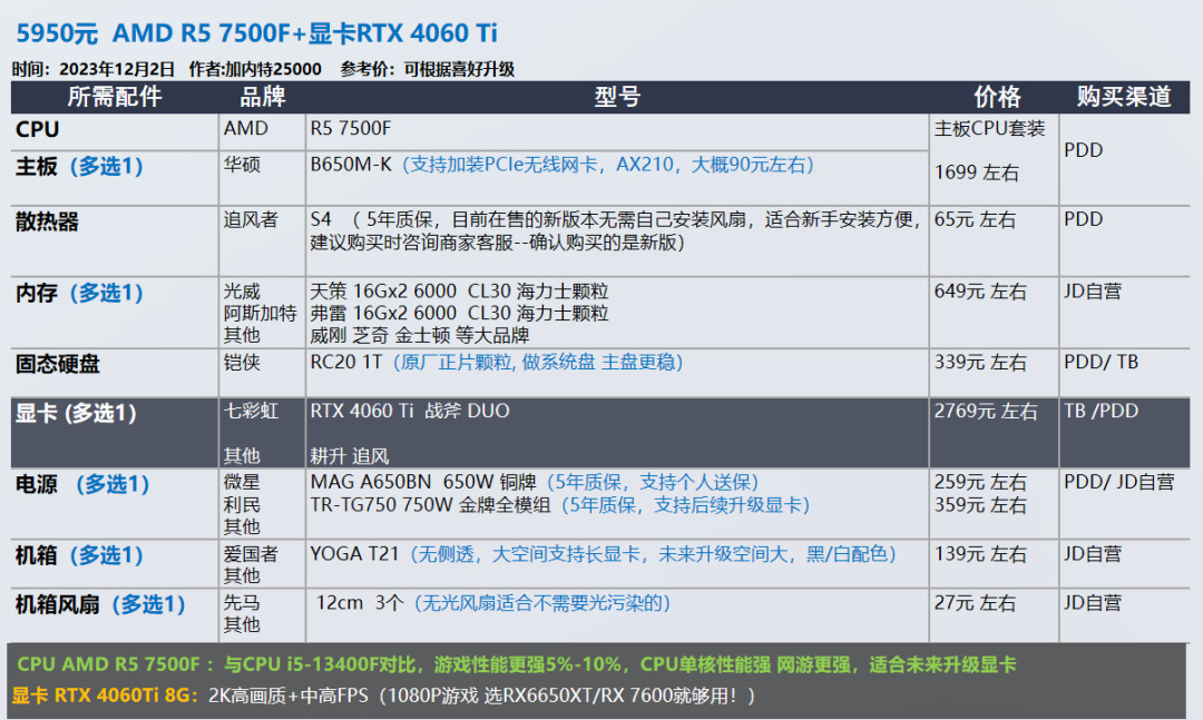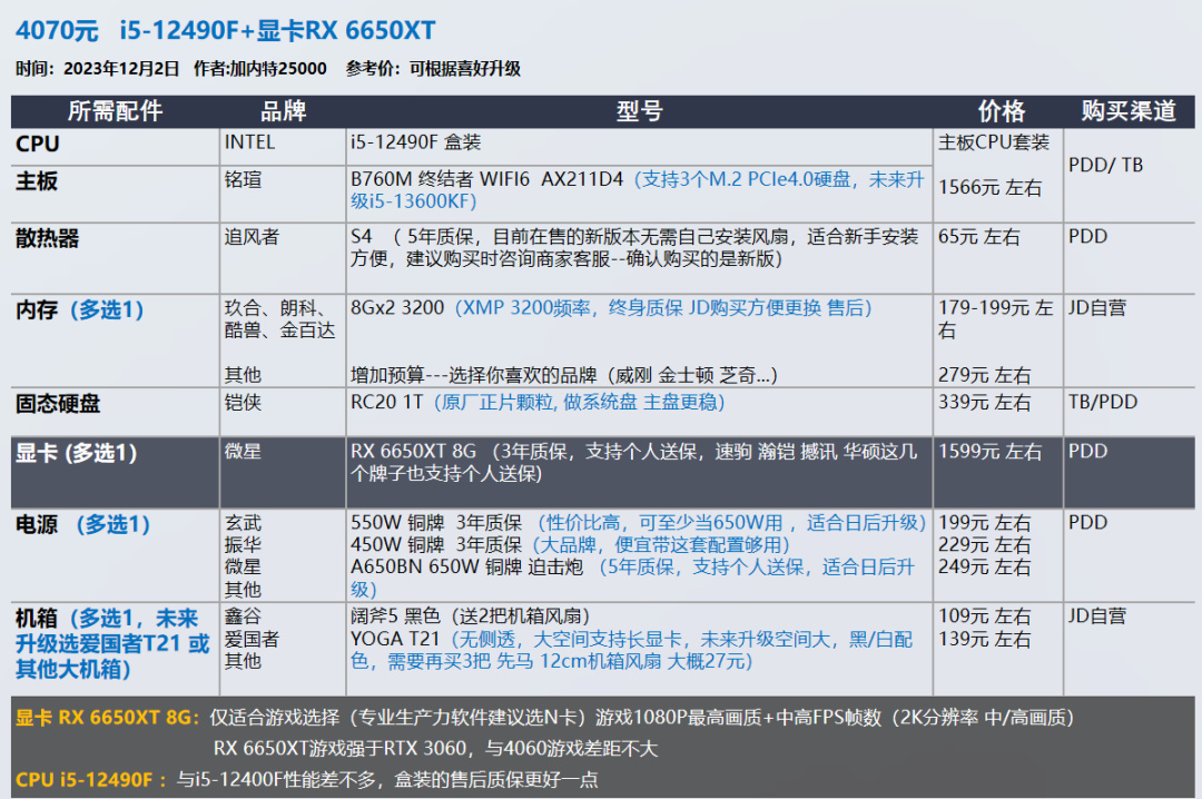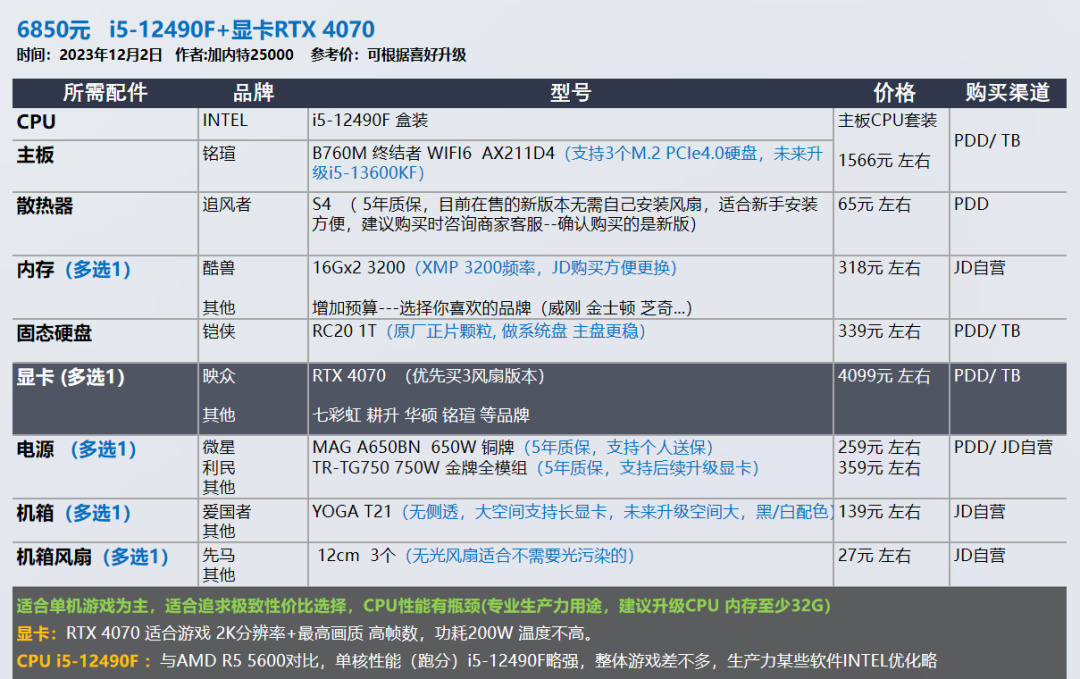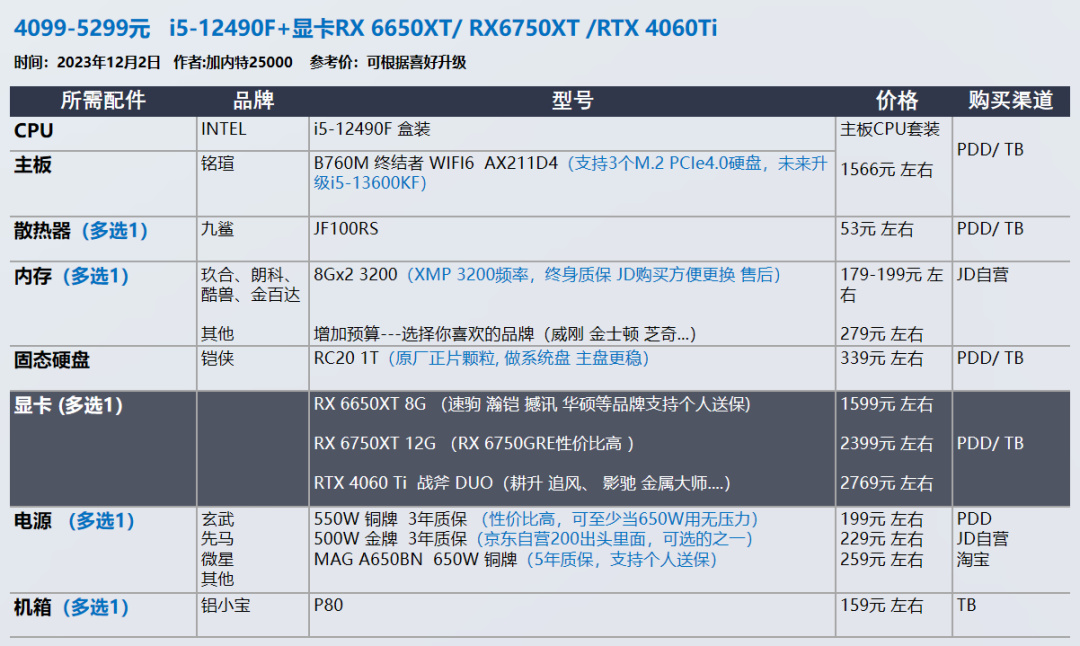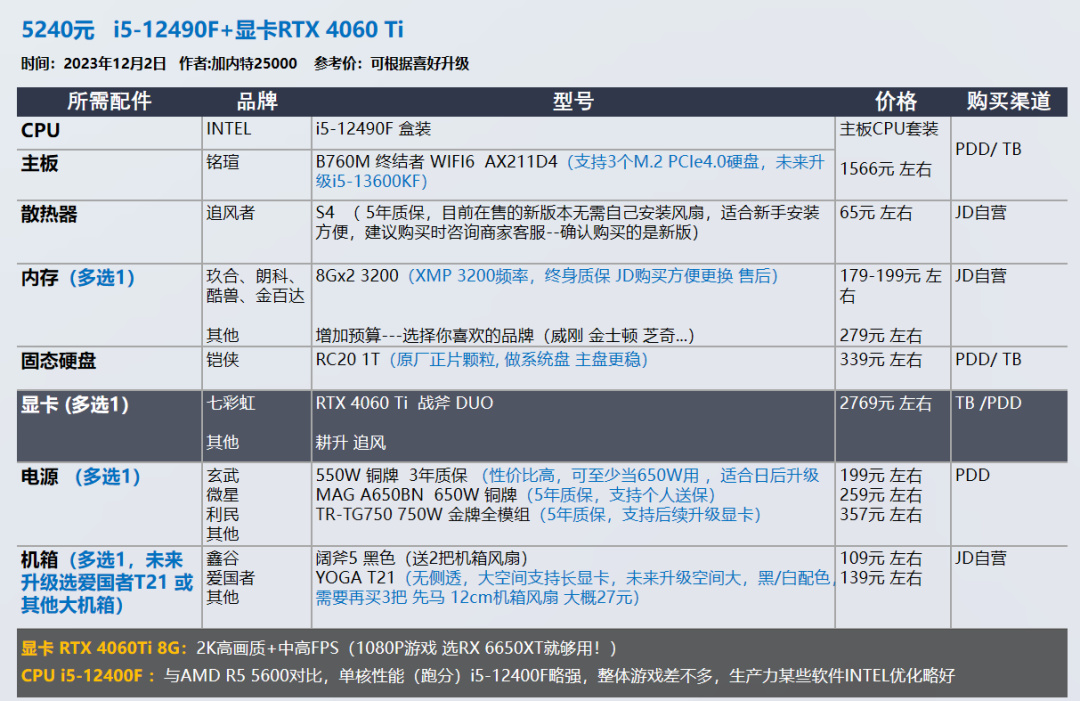 AMD显卡和CPU都不喜欢的朋友,可以参考i5-12400F i5-12490F ,显卡4060Ti这两套。