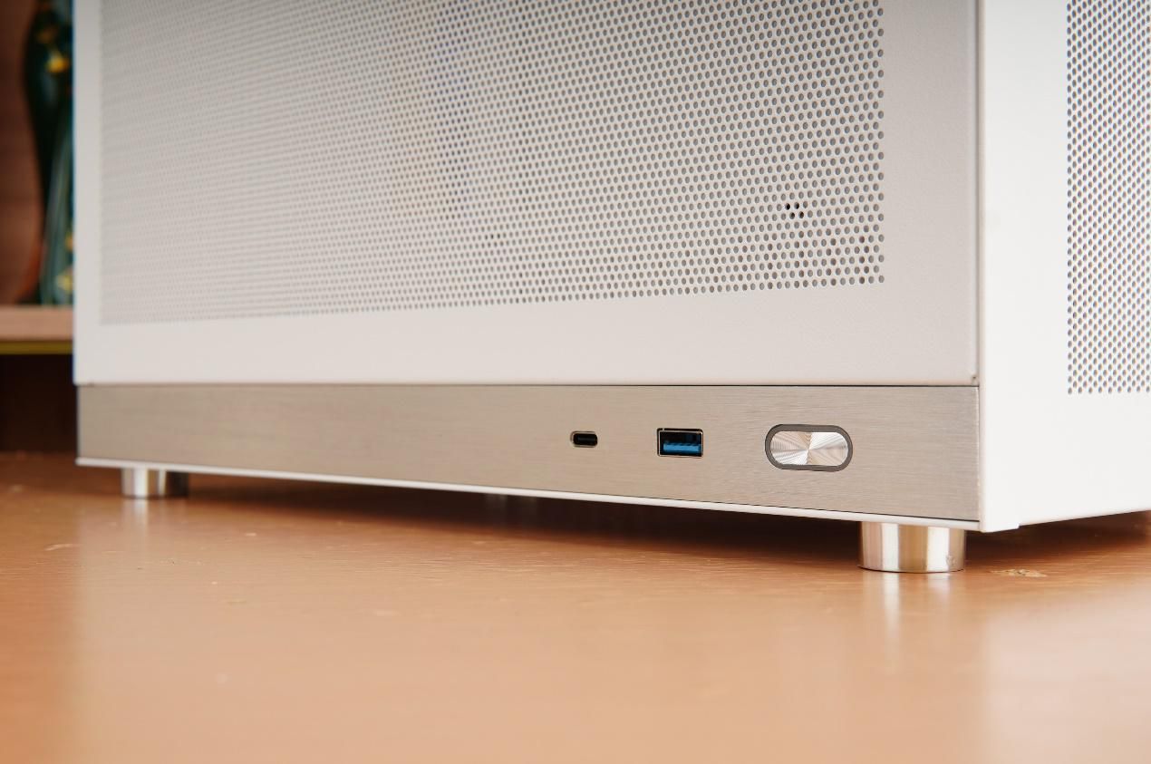 闪鳞G400依然保留了主板仓侧面也就是靠近人右手边的底部加入了一条拉丝铝合金装饰条,并且电源开关以及USB接口都放置了在这里,这种设计对于把机箱放在桌面上的玩家在操作时候自然是更加方便的,不论是开机还是插拔USB设备再也不用盲插了,更加符合桌面使用习惯,开机的时候电源键周围还有一圈的灯带包围。值得一提的是闪鳞G400标配的Type-C接口为USB3.2 GEN2的10GBPS速度,外接固态硬盘盒的时候也可以跑满速度了。