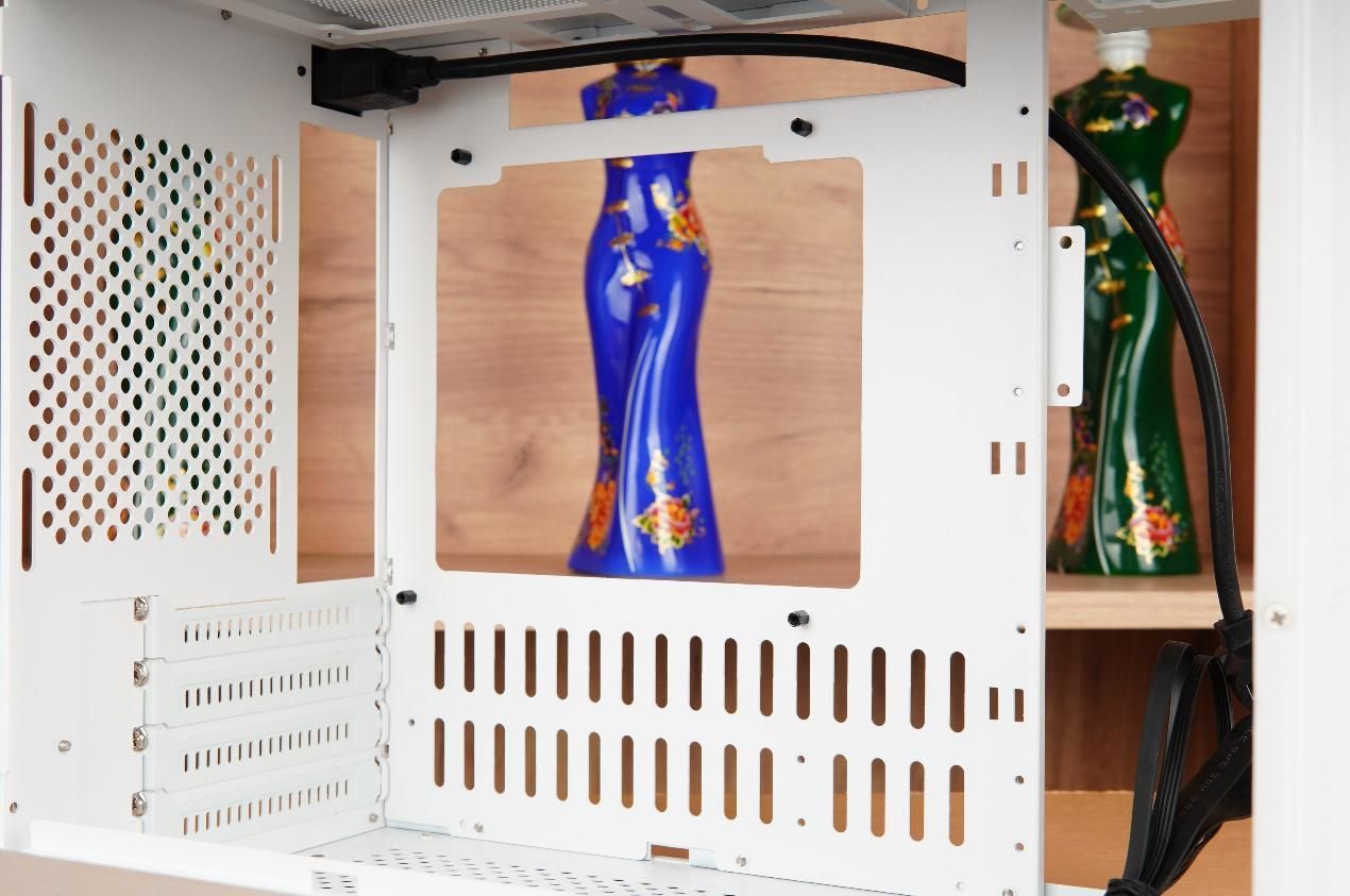 机箱内部的五金结构相较于G200并无太大的变化,主要变化还是主板板型支持由原来的ITX扩大至M-ATX机箱,常规的直插式主板结构。机箱内部最高可以支持164mm高度的风冷,不用再局限于下压式,对于CPU选择的上限也有了提高。显卡槽位为4槽,兼容长度为345mm以内的显卡,这个长度以及足够放入目前市面上大部分的3风扇显卡了。机箱整体尺寸维持在了352mm×188×282mm(L×W×H),应该是算得上目前市面上体积最紧凑的M-ATX机箱之一了。