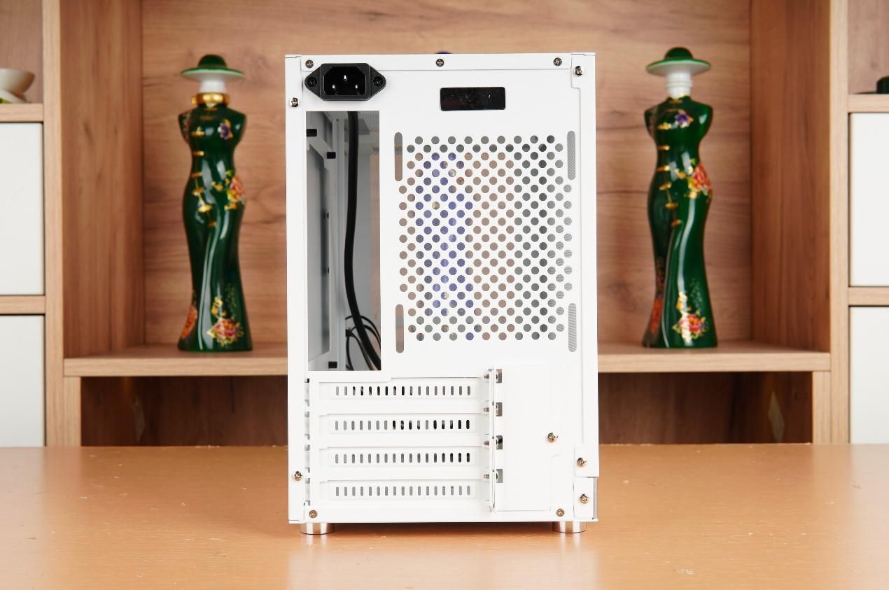 从机箱背面可以看到闪鳞G400的机箱的PCIe扩展槽增加至4槽,与普通M-ATX机箱无异,背部的12CM风扇安装位得到了保留。