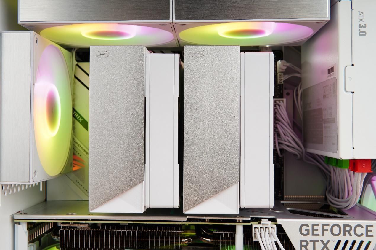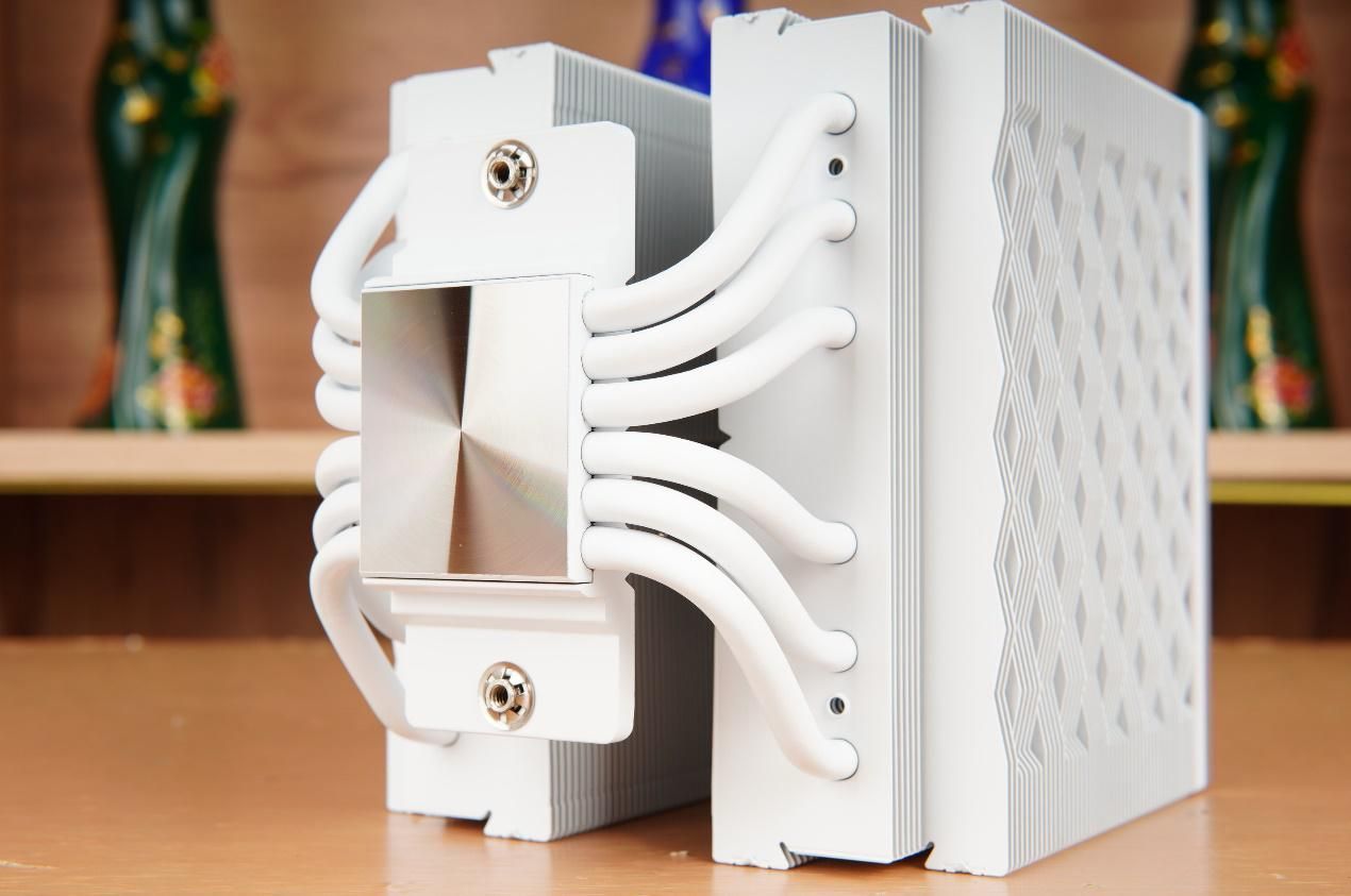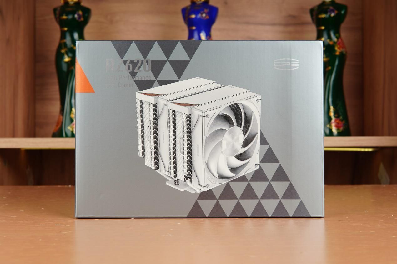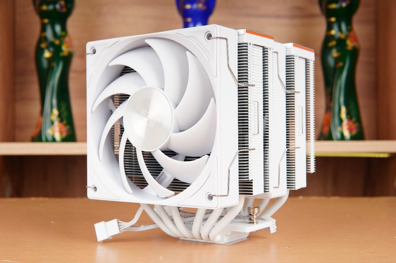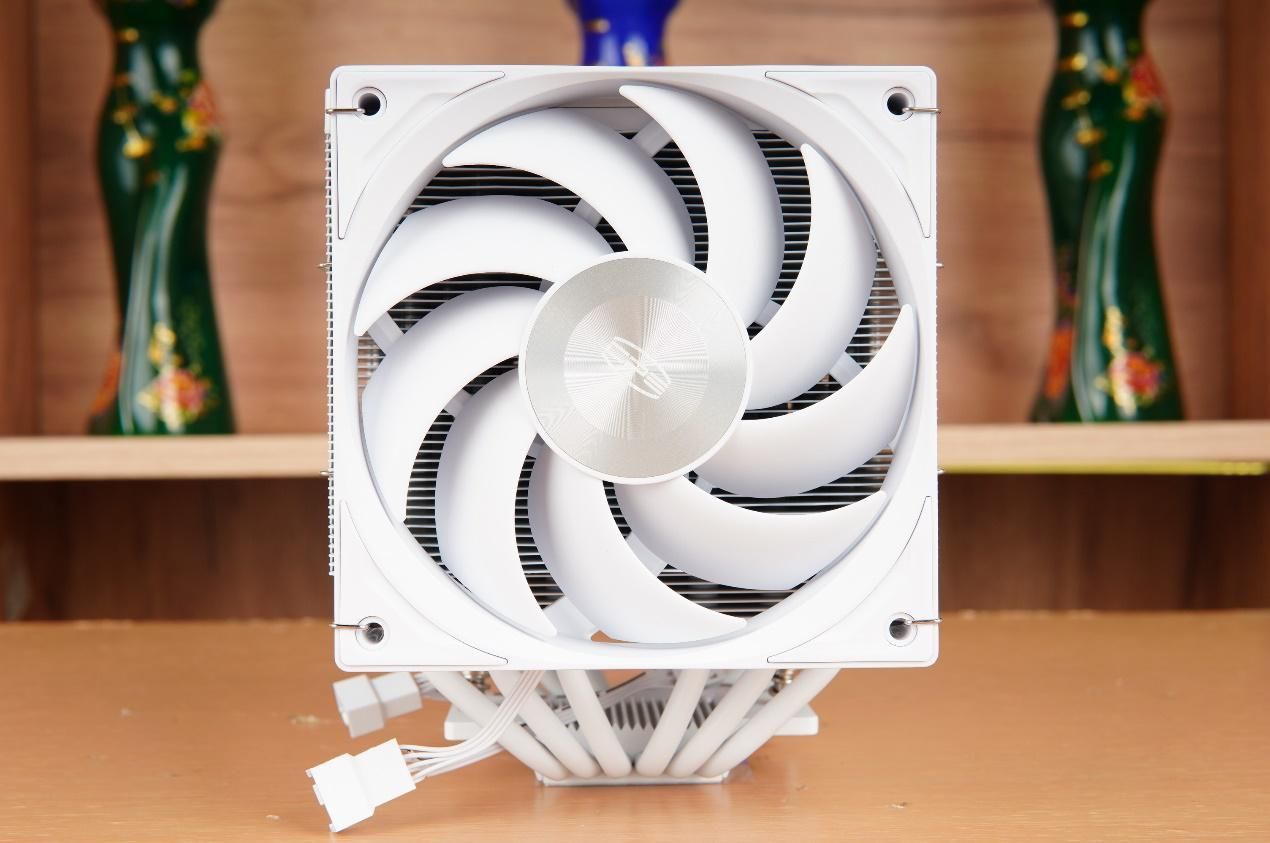 超频三RZ620在外观方面完全摒弃了旧的设计语言,转而采用了全新的“三角几何”品牌设计元素点缀产品细节的方方面面,扇轴承处还有星环金属轴心点缀,新的CPS品牌LOGO也非常具有质感,不得不说颜值方面在目前的双塔散热器中绝对是数一数二的。除了图上的白色版本以外还有质感更高的黑色版本。