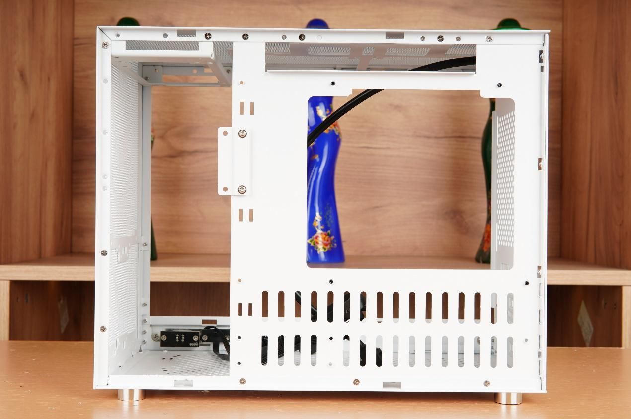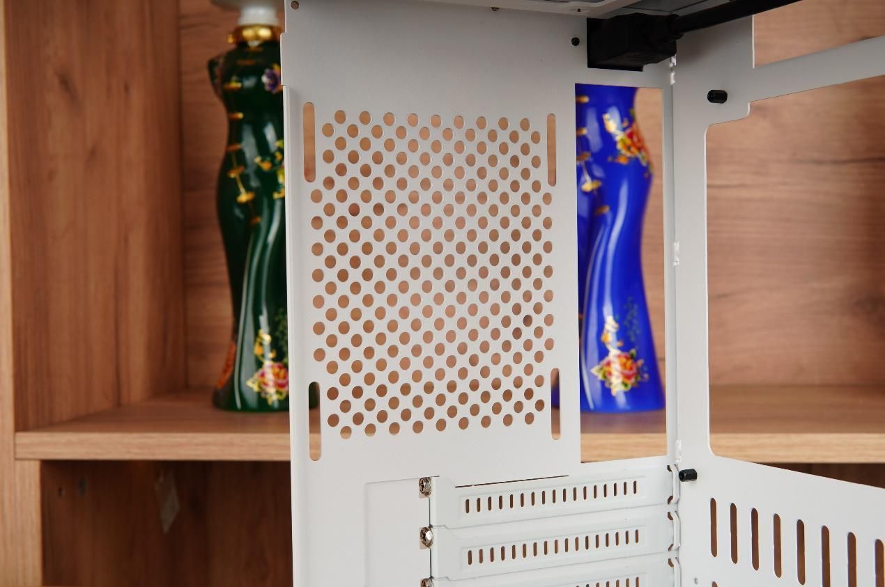 闪鳞G400的两侧均采用网面设计,不过由于机箱内部的五金结构更接近于常规的M-ATX机箱,因此背板Mesh网面面积也同步有所减少,仅保留了底部靠近显卡安装位置的部分。实测机箱的SPCC板材用料厚度表显为1.6mm,整体强度、质量方面非常不错,这也远非更低价位同类产品可比拟的地方。