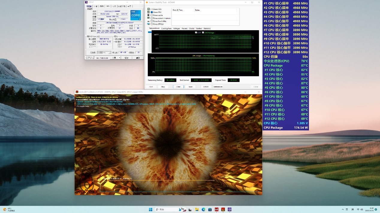 极限温度测试方面,在持续双烤10分钟后Intel酷睿i5-13600KF温度保持在76°C,核心温度稳定在87°C,P核保持4.98Ghz,E核保持在3.89GHz,全程没有降频的出现,CPU温度总体表现不错;GPU的温度则维持在了60°C,表现非常出色。可以看到闪鳞G400的散热能力还是可以的,特别是显卡,表现优异,CPU方面得益于超频三RZ620的实力也压制在了不错的温度上。