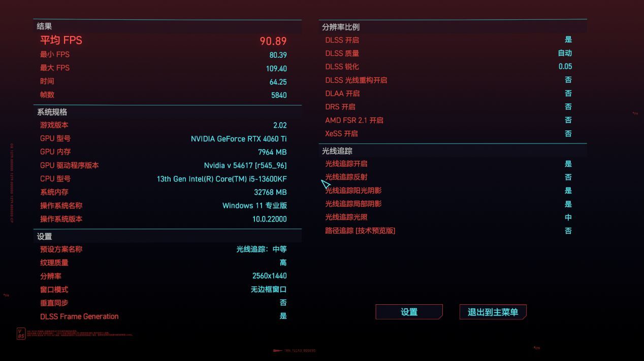 赛博朋克2077,开启预设光线追踪中等,开启DLSS自动,平均FPS达到90.89。
