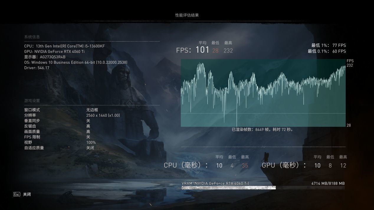 刺客信条:英灵殿,预设高画质,平均FPS达到101。