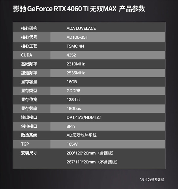 快科技12月5日消息,影馳官方正式發佈RTX 4060 Ti無雙MAX,這是全球首款單插槽輕薄設計的RTX 40系列顯卡,厚度只有區區20毫米(長度267毫米、高度111毫米)。