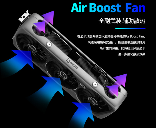 同时还有Air Boost Fan辅助散热系统,显卡顶部两侧加入了两个小风扇,支持智能启停,搭配轴风式风道,可快速排走热量,号称比传统三风扇效果更佳。