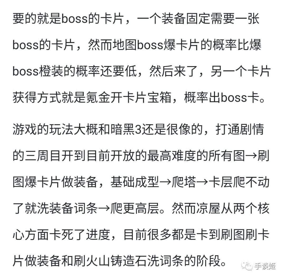 游戏与《暗黑》一样拥有赛季制,在赛季之中,你可以选择一个职业,或是探索地图击败怪物,或是爬塔击败怪物,或是与小伙伴联机击败怪物,总之,怪掉落经验与装备与卡牌与石头,升级可点技能,进行技能搭配,装备可强化,可用卡牌合成,可用石头改造,最后装备成型,这个赛季基本上就玩到头了,下个赛季,一切归零,从头再来。
