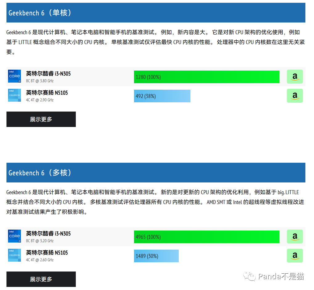 在Geekbench 6中,不管是多核还是单核,N305都要比N5105高很多,CPU性能提升大概在240%左右。同时N305相较于N5105在L2与L3的缓存上也做了提升,L2缓存从1.5MB增加到了8MB,而L3缓存也从4MB增加到了6MB。并且Pcle带宽也提升了1GB/s。