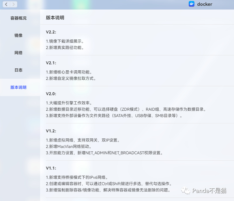 极空间一直致力于优化和增强对Docker应用的支持。在版本说明中可以看到,极空间对docker的更新很是频繁。目前,极空间的Docker已经引入了MacVlan网络驱动,为用户提供更高效和稳定的网络连接。此外,极空间还加入了核心显卡一键调用功能,使用户能够轻松地利用核心显卡进行计算和图形加速。另外,极空间还提供了真实路径功能,允许用户以真实路径的方式访问和操作文件,增加了数据的可靠性和可用性。