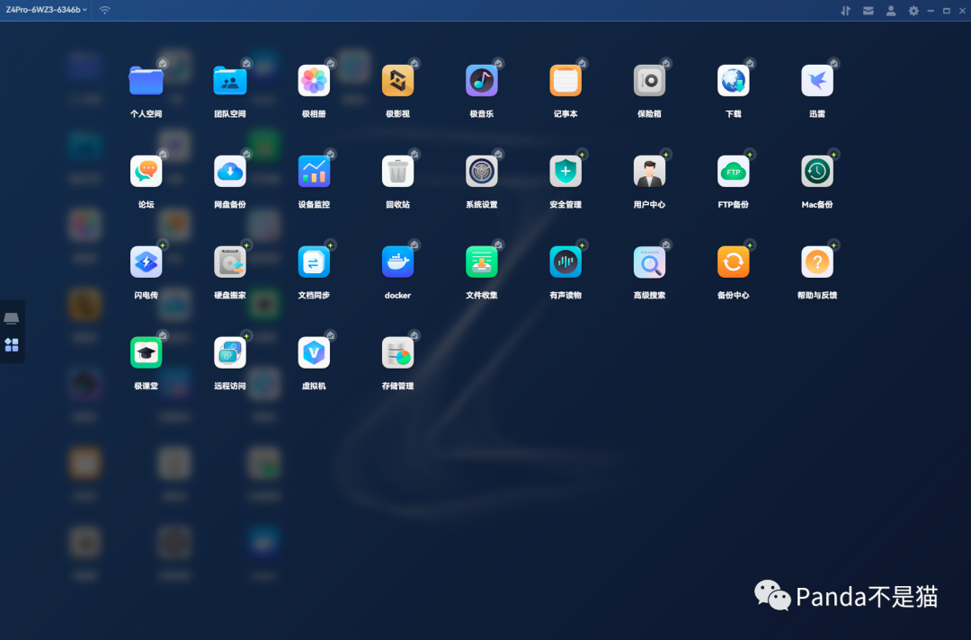 玩过这么多NAS设备,熊猫最常用的便是Docker容器和虚拟机。目前,极空间Z4系列的所有产品都已经支持虚拟机功能。为了解决虚拟机性能问题,创建虚拟机时需要使用M.2高速存储作为介质。这样的设计考虑到了虚拟机的性能需求,通过使用M.2作为虚拟机存储介质可以极大地解决虚拟机卡顿、鼠标拖影等问题,提供更流畅的虚拟机体验。(因为机器为工程机,这里就不折腾虚拟机了)