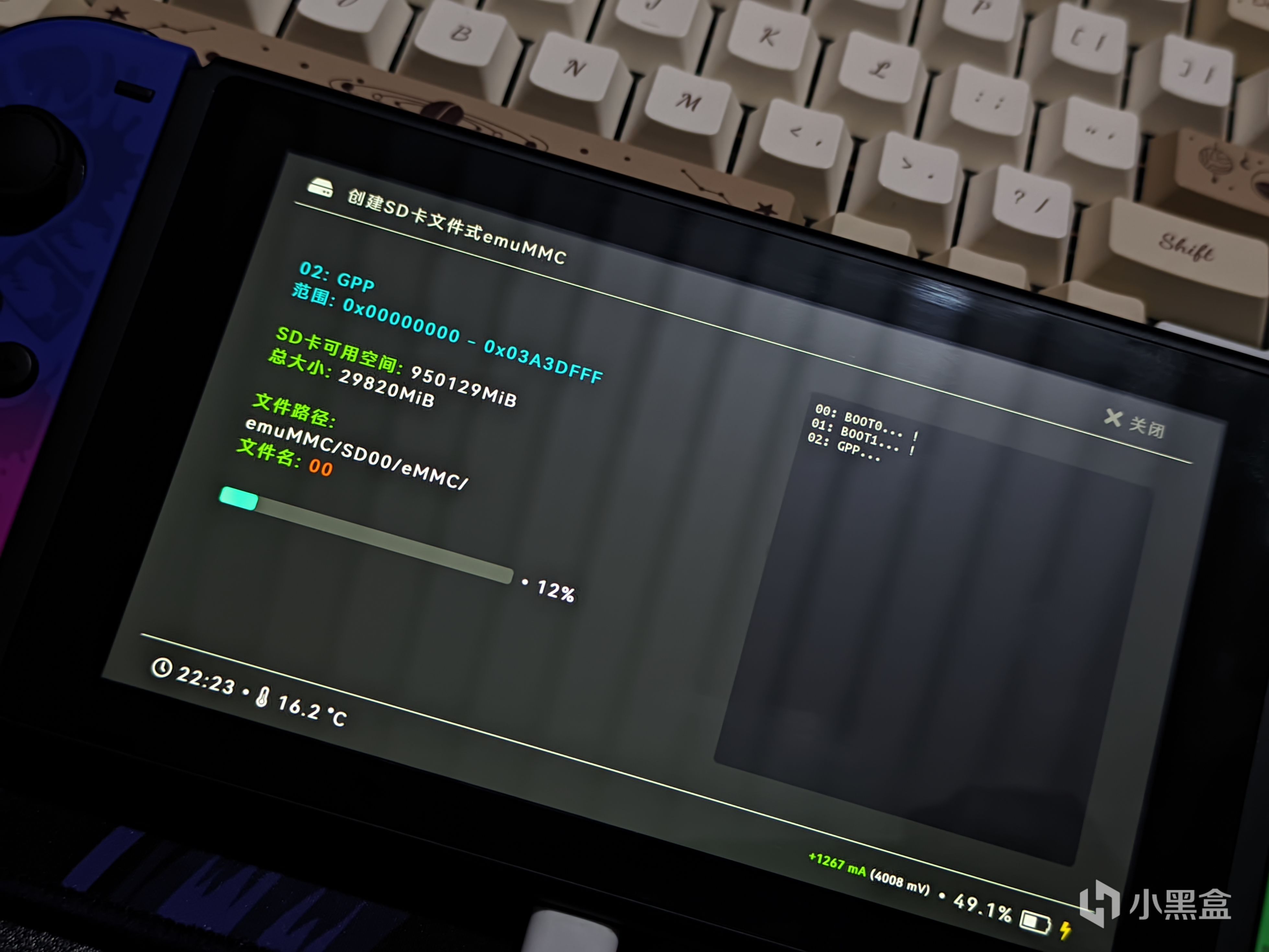 第一步需要对TF卡进行一个虚拟系统的创建,这部分需要将相关的启动项以及文件拷贝到TF卡中,然后在插入机器后单击电源键,在界面中选择虚拟系统,点击第二个页面的创建emuMMC选项,然后点击SD卡文件就可以进入这个界面,等待其完成创建就好,注意这部分不要选择创建分区,得益于内存卡本身速度的原因,这部分进行的很快,全部创建完毕就可以点击关闭然后启动虚拟系统了,建议只用虚拟系统和正版系统,中间的大气层真实系统不要动它,很容易被BAN机。