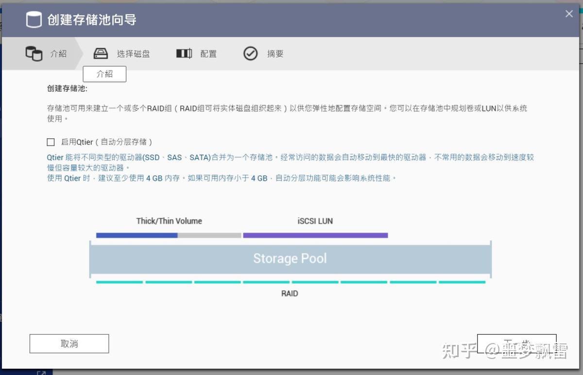 然后根据自己的需求来选择是否使用Qtier自动分层存储技术。这里由于我自己是决定把后续添置的M.2 SSD作为单独的存储卷来使用,所以就没有将其与机械硬盘进行混合使用了。