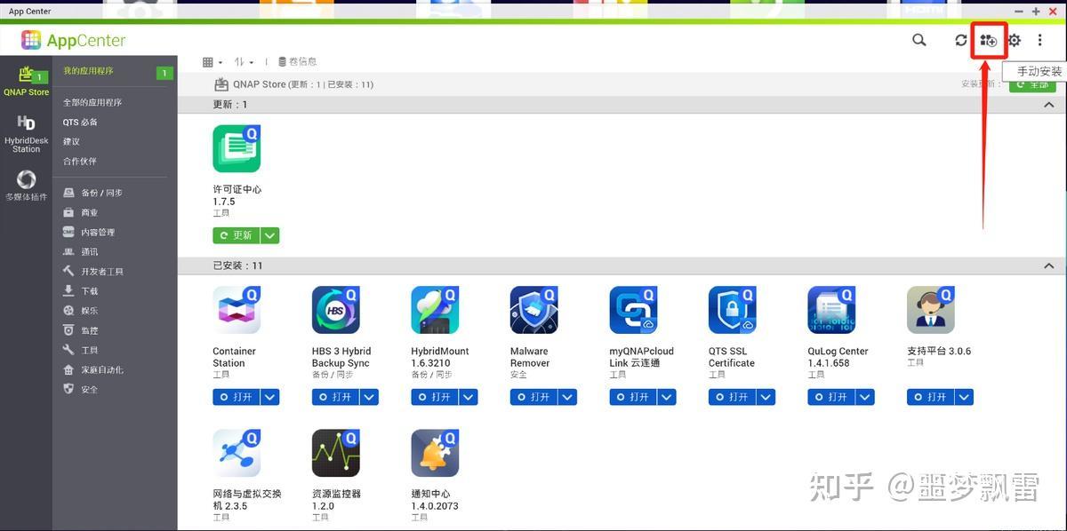 (3)进入威联通的App Center,点击右上角“手动安装”。
