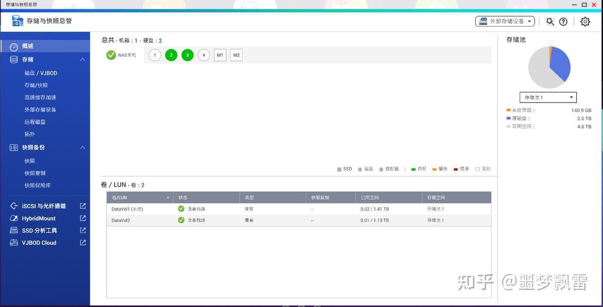 存储池可以理解为对实体硬盘的一种逻辑封装结构,甭管咱们给硬盘用了什么RAID 0、RAID 1、RAID 5之类的阵列,在威联通系统中,都由存储池来进行表示,这样咱们在实际的操作过程中都不用管底层的磁盘阵列细节了,一切操作都针对存储池这个逻辑概念来进行即可。