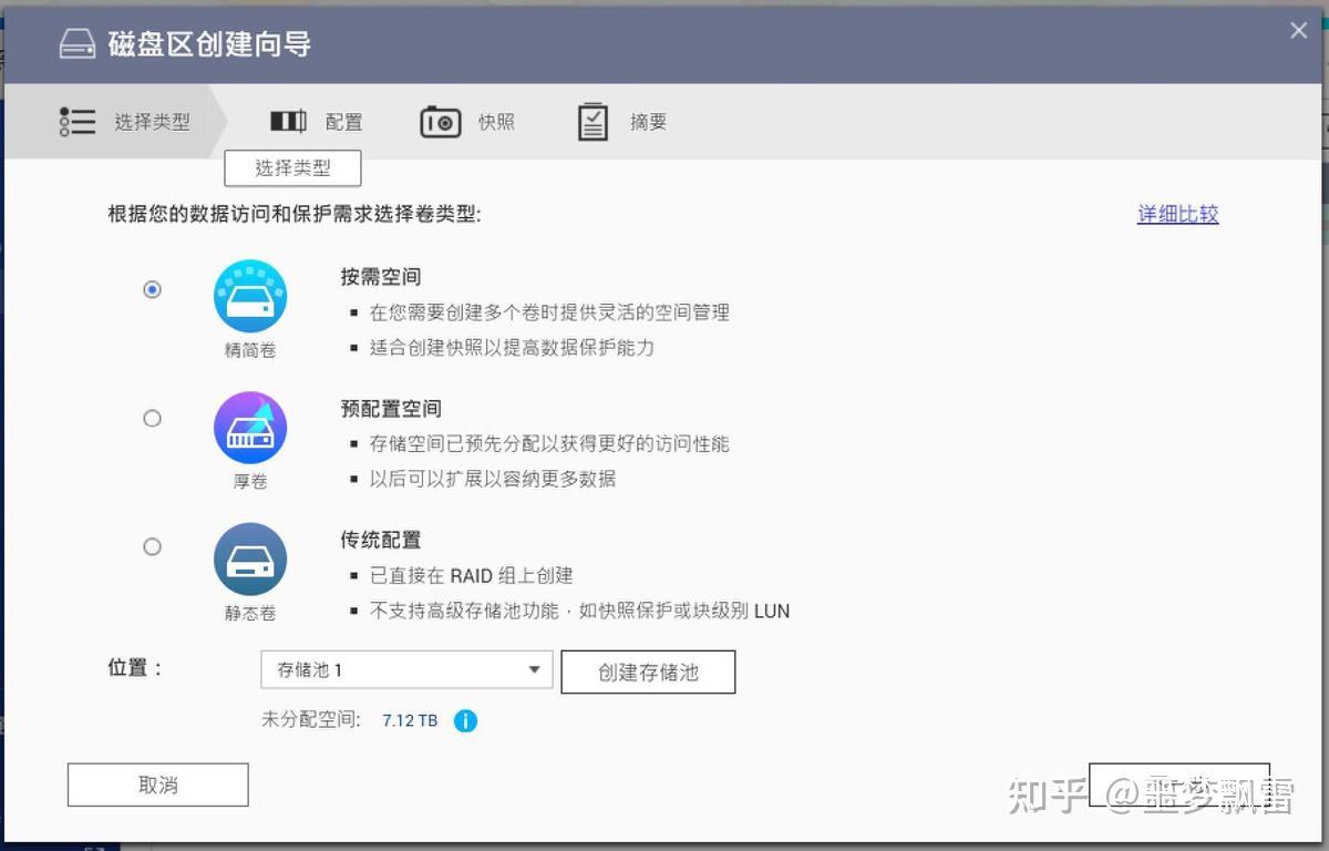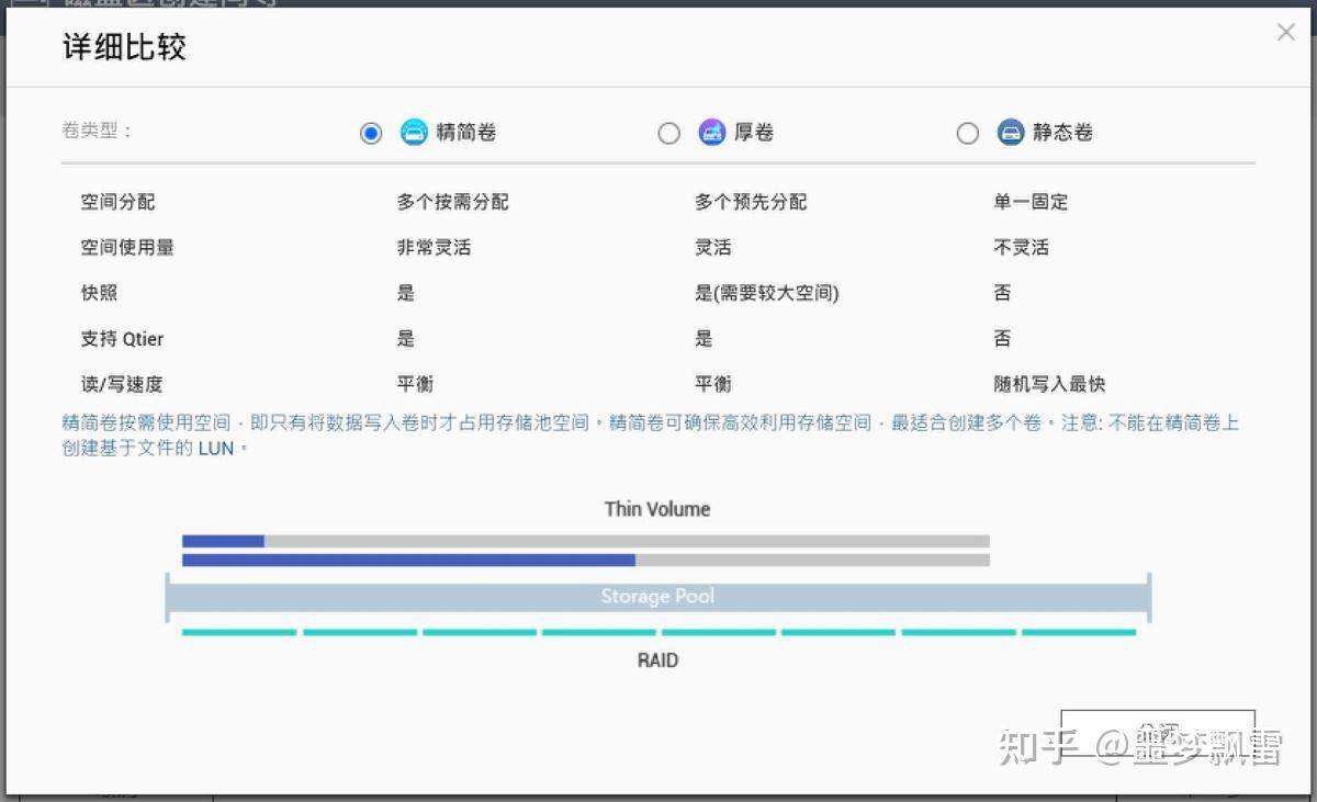 然后接下来我们需要选择相应的存储卷的种类了。在威联通中存储卷分为静态卷、厚卷和精简卷。这里建议选择精简卷,毕竟快照功能真的很重要,可以使用更小的空间来实现对数据的备份和保护。