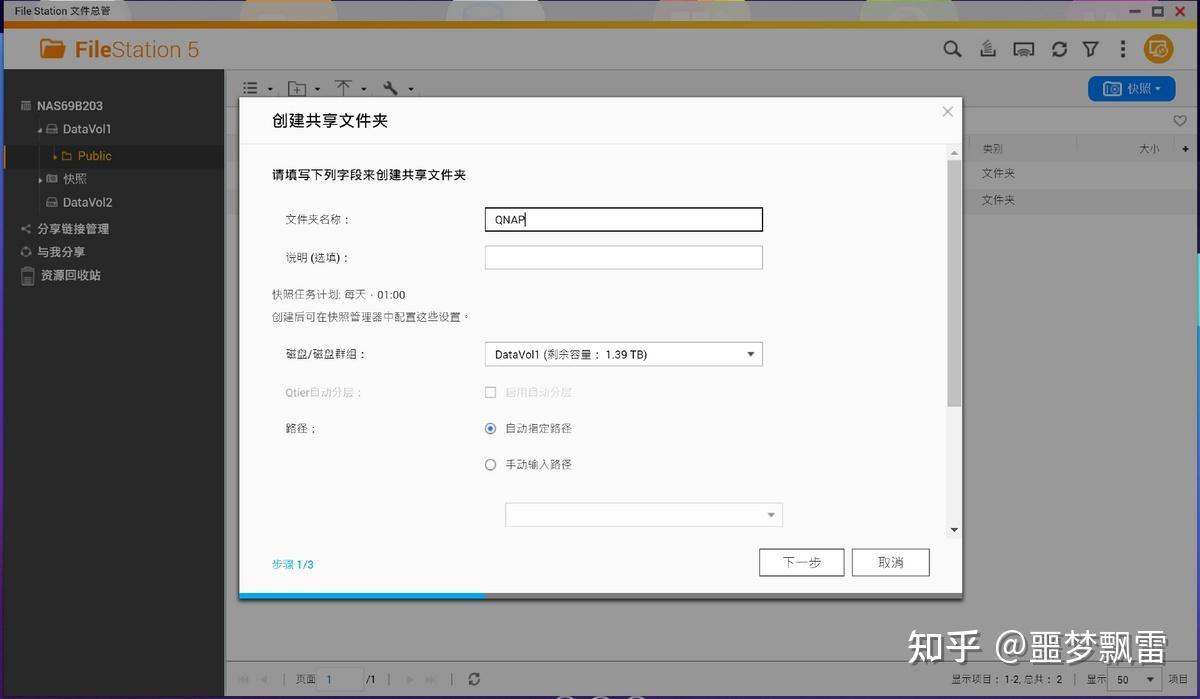 然后在此之上还可以在存储卷中创建共享文件夹,这就和我们在电脑分区中新建文件夹是一个操作了,只不过在NAS中对共享文件夹的权限管理更加细化,可以单独为不同的NAS用户创建不同的权限方案。