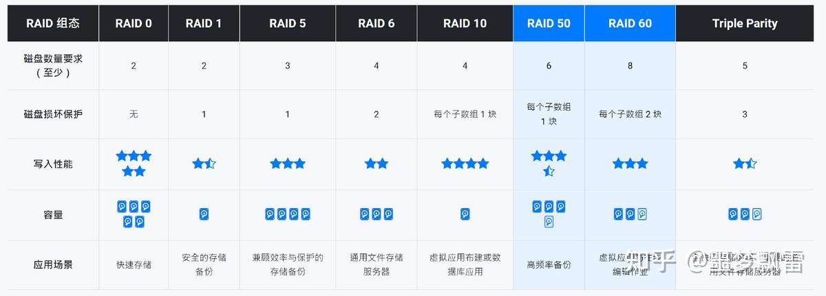 其中RAID 5需要至少3块硬盘组成阵列,在保存数据时,会将数据和对应的奇偶校验信息存储到阵列中的不同硬盘上。如果其中一块硬盘发生损坏,则可以通过阵列中剩余硬盘中保存的奇偶校验信息和参与数据来推算并重建出损坏硬盘上保存的内容。在RAID 5阵列下,最高可以允许损坏一块硬盘,同时总容量会下降为(n-1)块硬盘的容量之和。