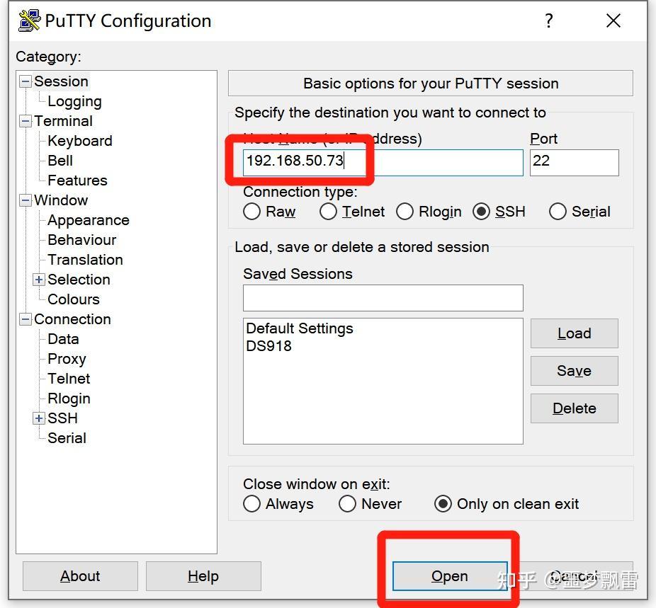 (5)使用putty这个软件,在图中所示位置输入NAS的IP地址,然后点击“OPEN”。