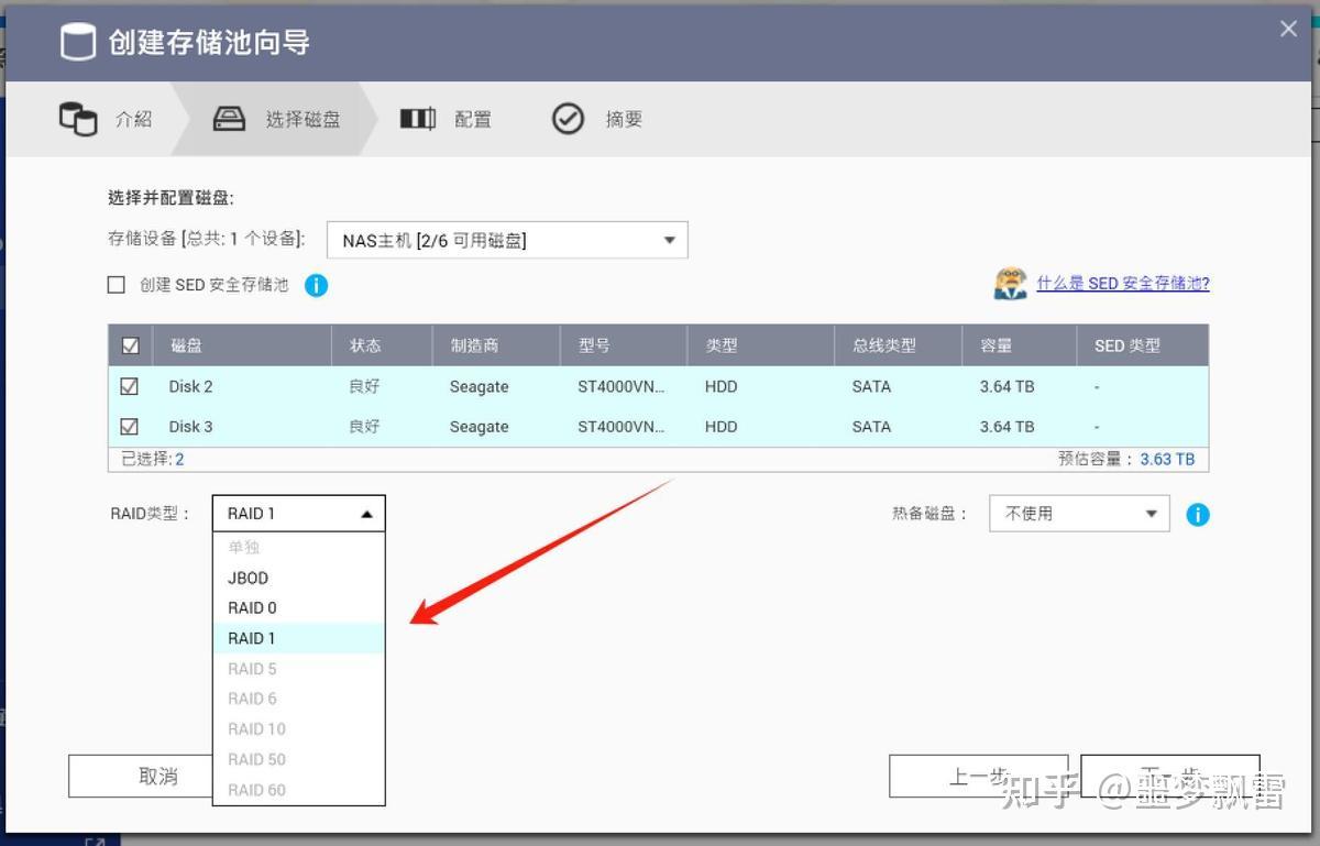 接下来我们可以选择需要的磁盘RAID类型,这里简单为大家介绍一下各种RAID类型的含义,大家可以根据自己的数据重要性灵活选择。