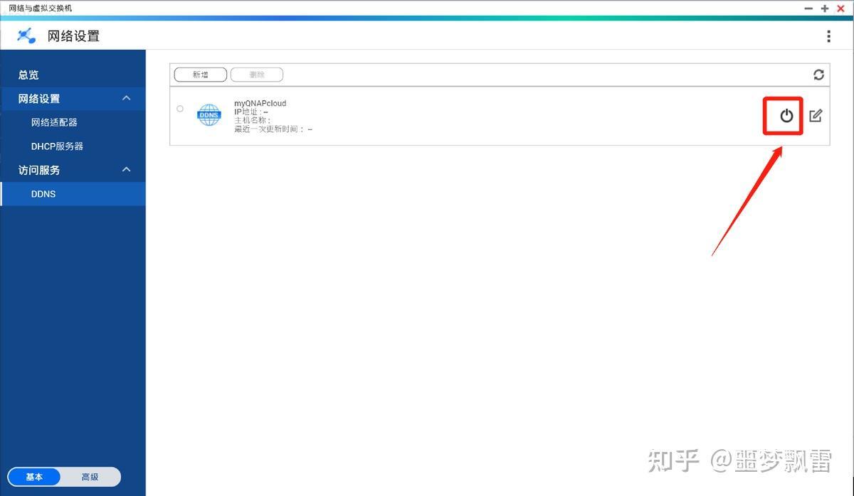 1.依次点击 控制台——网络&文件服务——网络与虚拟交换机——DDNS,打开myQNAPcloud云服务,然后点击红圈内的“启用”按钮。