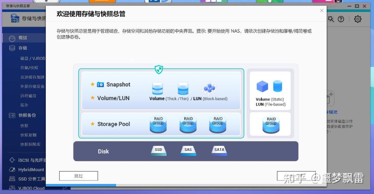 一进系统,我们就会被提示设置存储池和新建卷,这是我们使用NAS上的文件系统的必备步骤。