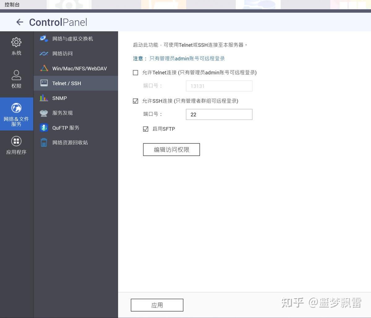 (4)依次点击 控制台——网络&文件服务——Telnet/SSH,打开威联通的SSH功能,允许SSH连接: