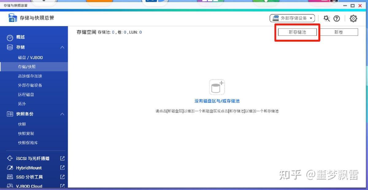 那么简单了解了以上知识,我们就开始来设置存储池和新建存储卷的操作吧。首先在存储与快照总管的右上角点击“新存储池”按钮: