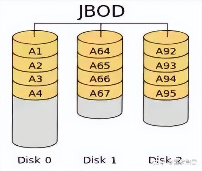JBOD(Justabunchofdisk)只是简单将多个磁盘合并成一个大的逻辑盘,并没有任何的数据冗余。数据的存放机制就是从第一块磁盘开始依序向后存储数据,写满一块硬盘后再写入另一块。如果某个磁盘损毁,则该盘上的数据就会丢失。
