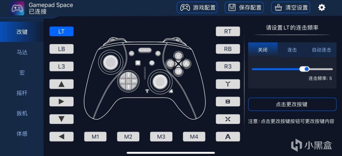說到多平臺設備連接的話,就不得不提到明品用的這個gamepad space,在移動設備上,安卓ios都可以下載,可以改鍵位和校準,馬達調試,宏功能設置等等操作,調試完適合自己的手柄玩起來真的很爽。