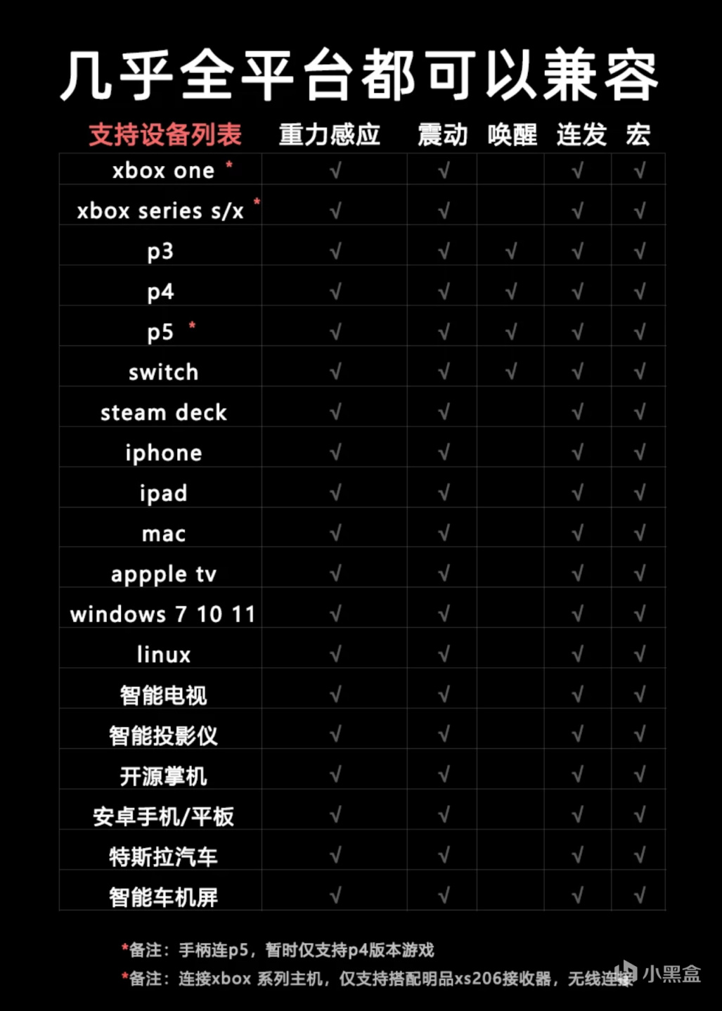 除了上述設備外,還支持一些老設備比如說2006年生產的ps3,明品發揮了一直以來的優良傳統,多平臺兼容,真的是讓玩家買的放心,玩的安心,輕鬆對應家裏的一堆設備。不過對於上面的ps4來說,ps5的老哥可能要注意了,這個手柄目前只支持ps5上的ps4版本的遊戲,如果有介意的話,還是要慎入。