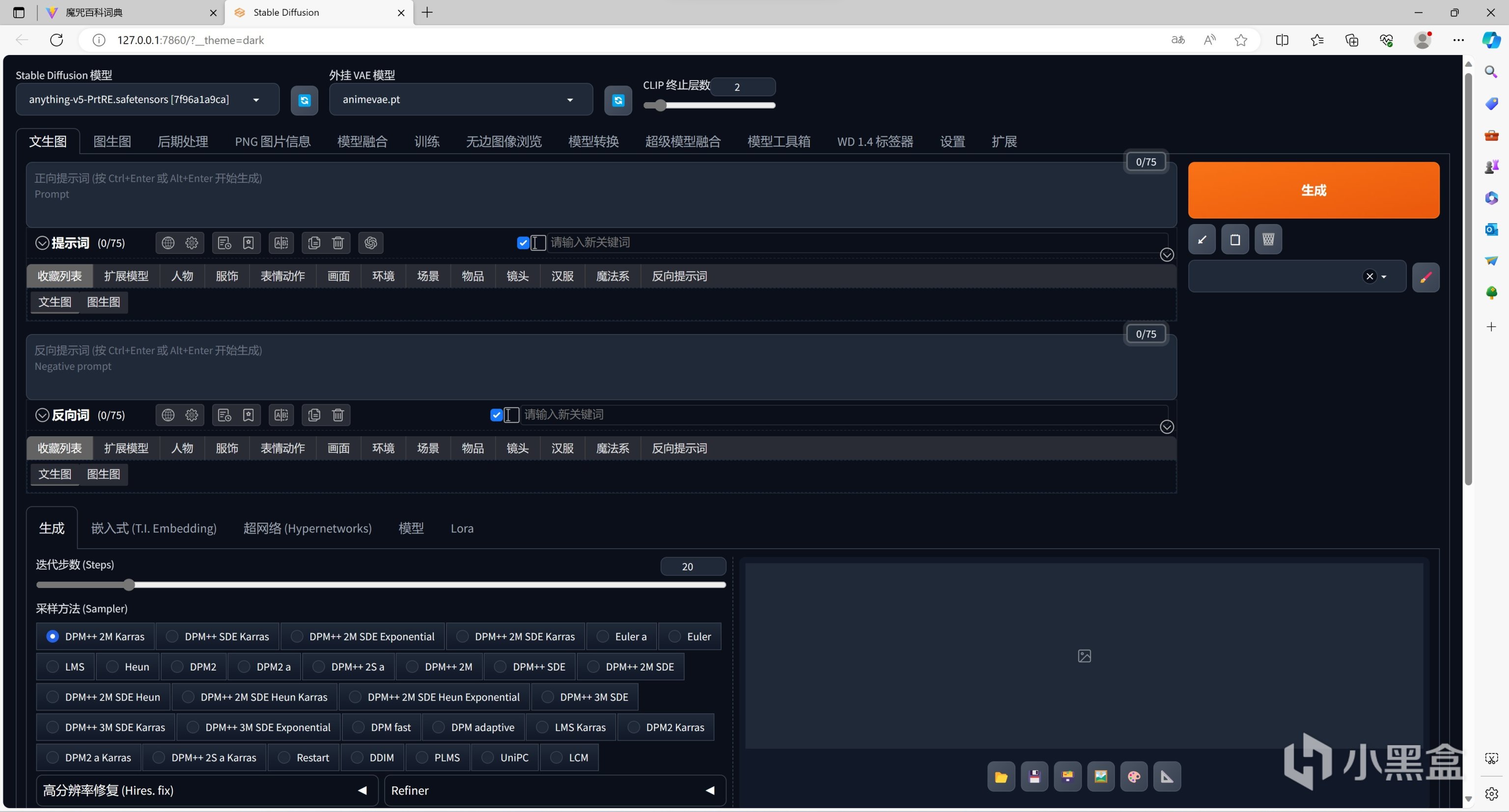 ⑦正常启动后就会自动打开Stable Diffusion的Automatic111 UI界面,看起来是不是有点复杂?其实只简单生成图片玩玩的话很简单,上面那个大输入框是正面提示词,尽量用英文,也就是想生成图片的关键词,大致上分为质量控制和内容要求两类,比如“best quality”之类的就是控制质量的,而“girl,long leg”之类的就是负责内容的,这里就可以尽量发挥自己的想象力填写了,如果默认的模型里有相关内容,UI会提示的;