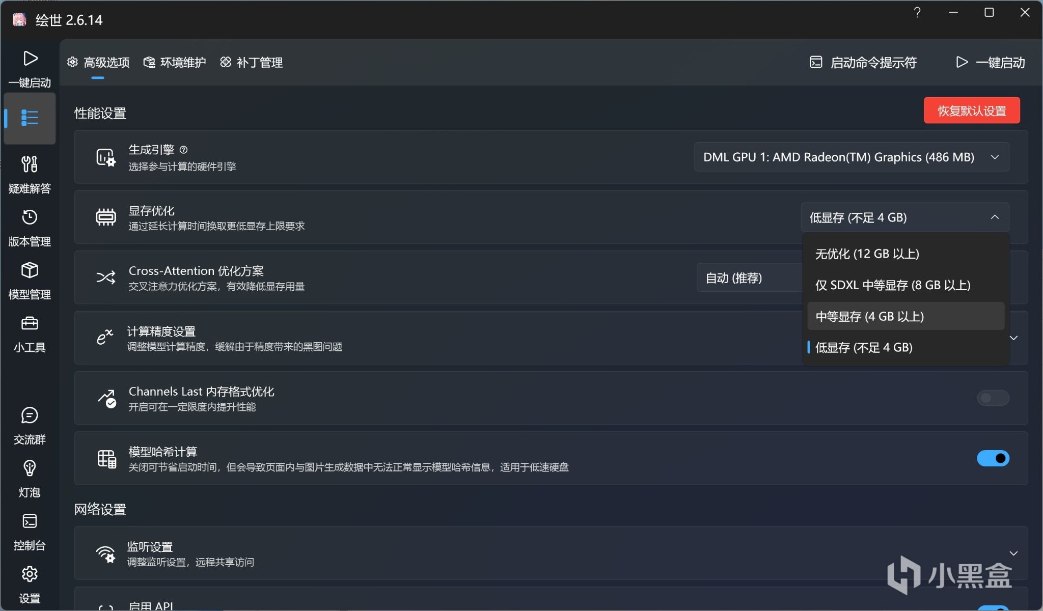 显存优化选项根据显卡的显存情况设置,Radeon 680M/780M集成显卡建议设置成“低显存”,4-8G显存建议选择“中等显存”,8-12G建议选择“仅SDXL中等显存”,12G以上就选“无优化”即可,压线的显存容量比如8G、12G建议向下选一档,例如8G显存就选“中显存”,不然爆显存的话会报错。