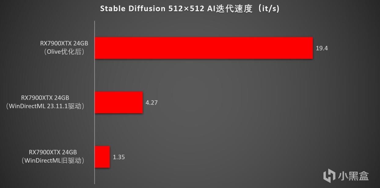 经过Olive优化之后,RX7900XTX可以跑出大约18-20it/s的速度,生成一张标准512×512图从原来的10秒左右提升到2-3秒左右,提升了3-5倍,还是相当可观的!(原文里还是早一点版本的模型,如今绘世启动器里带的模型用RX7900XTX跑一张图大约在3-5it/s左右)
