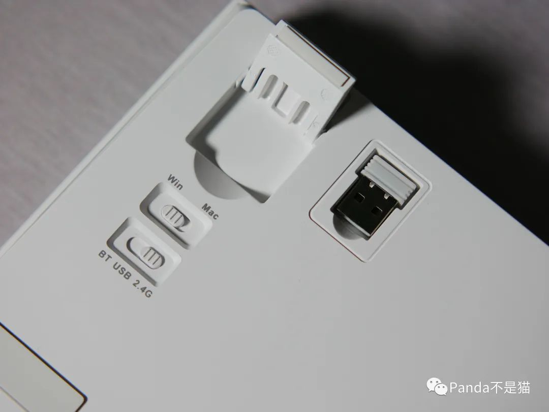 黑爵AK820 Pro在背面装备了两个切换模块,一个用于系统的切换,另一个用于模式切换。值得一提的是黑爵AK820 Pro的专属mac模式,为苹果电脑用户提供了更好的适配体验。通过简单切换,用户可以享受到黑爵AK820 Pro与苹果电脑的完美兼容。接收器也通过磁吸放置在背面的接收器槽中,即使大幅度的晃动也不会存在脱落的情况。