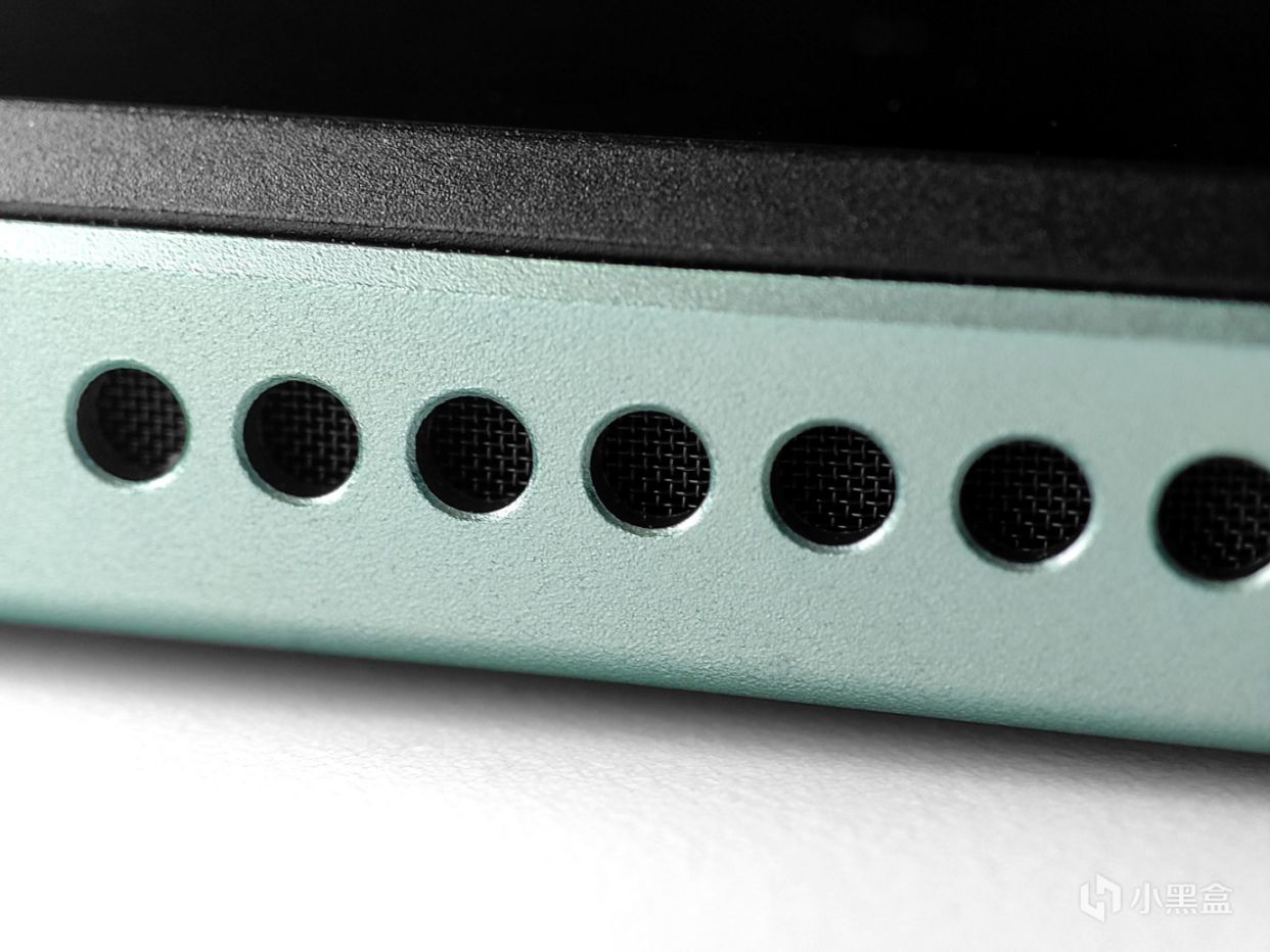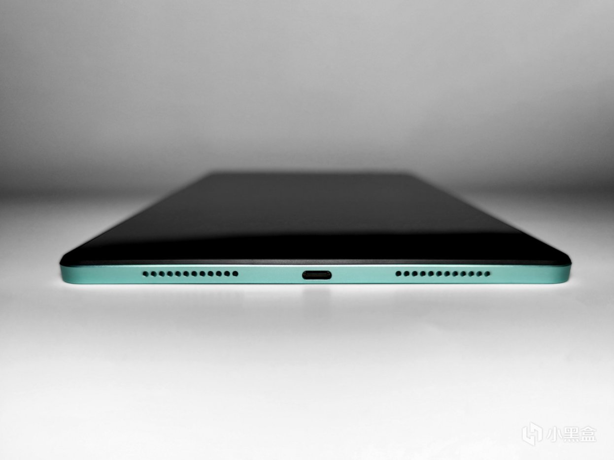 机身厚度7.05mm,以前置摄像头一侧的长边为顶部,翻到机身右侧短边侧的边框侧面,便可以看到,以中间的USB Type-C接口水平对称,两侧各有12个扬声器开孔。