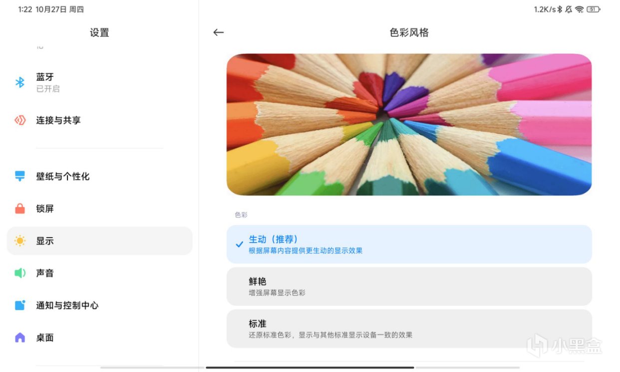 屏幕支持10bit色深,色彩模式可选生动 / 鲜艳 / 标准三种模式。