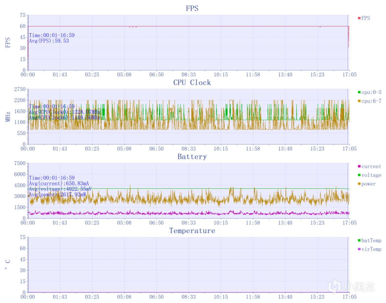 17分钟王者荣耀,超高分辨率 + 高帧率 + 极致画质,除了偶发小波动,基本稳一条直线下来,平均帧率59.53,50%亮度整机平均功耗2.6W。