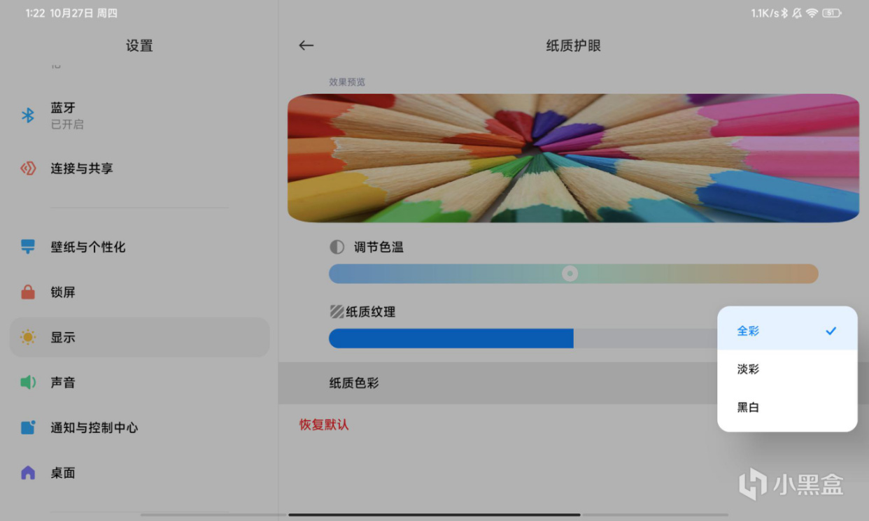 屏幕通过了SGS低视觉疲劳认证和莱茵TÜV硬件低蓝光认证,护眼模式提供了纸质护眼效果,可自定义色温、纸质纹理深浅和纸质色彩。