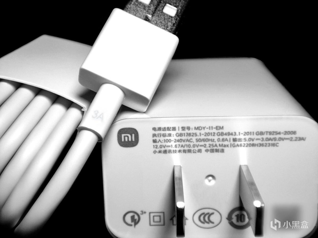 数据线Type-A端有标注最大电流为3A。白色两插脚电源适配器型号为MDY-11-EM,最大输出功率22.5W。