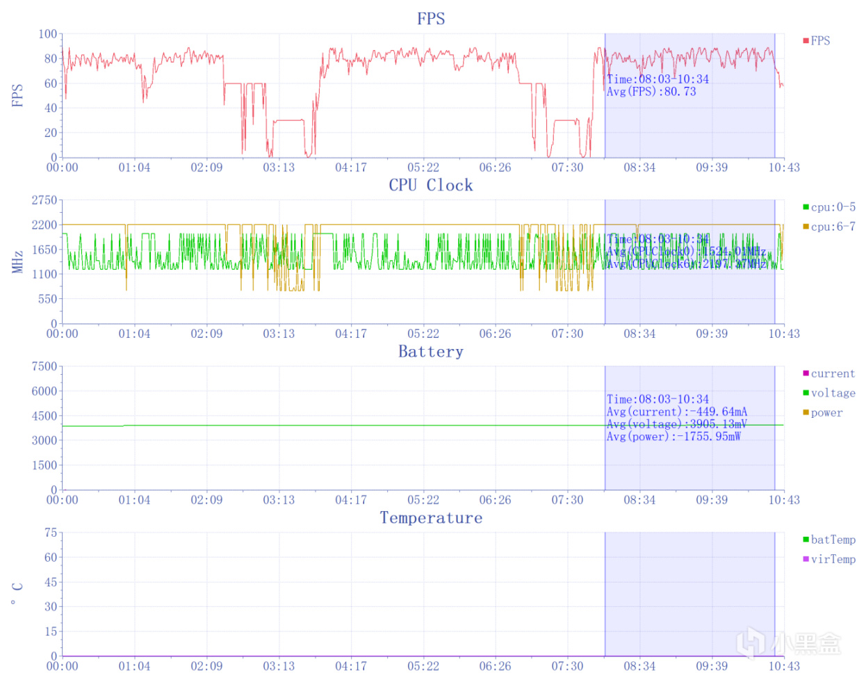 QQ飞车3把下来总时长10分钟多,超高画质超清分辨率超高帧率高特效等级,最后一把平均帧率80.73,毕竟是90Hz机型,冲到80玩起来不错了。