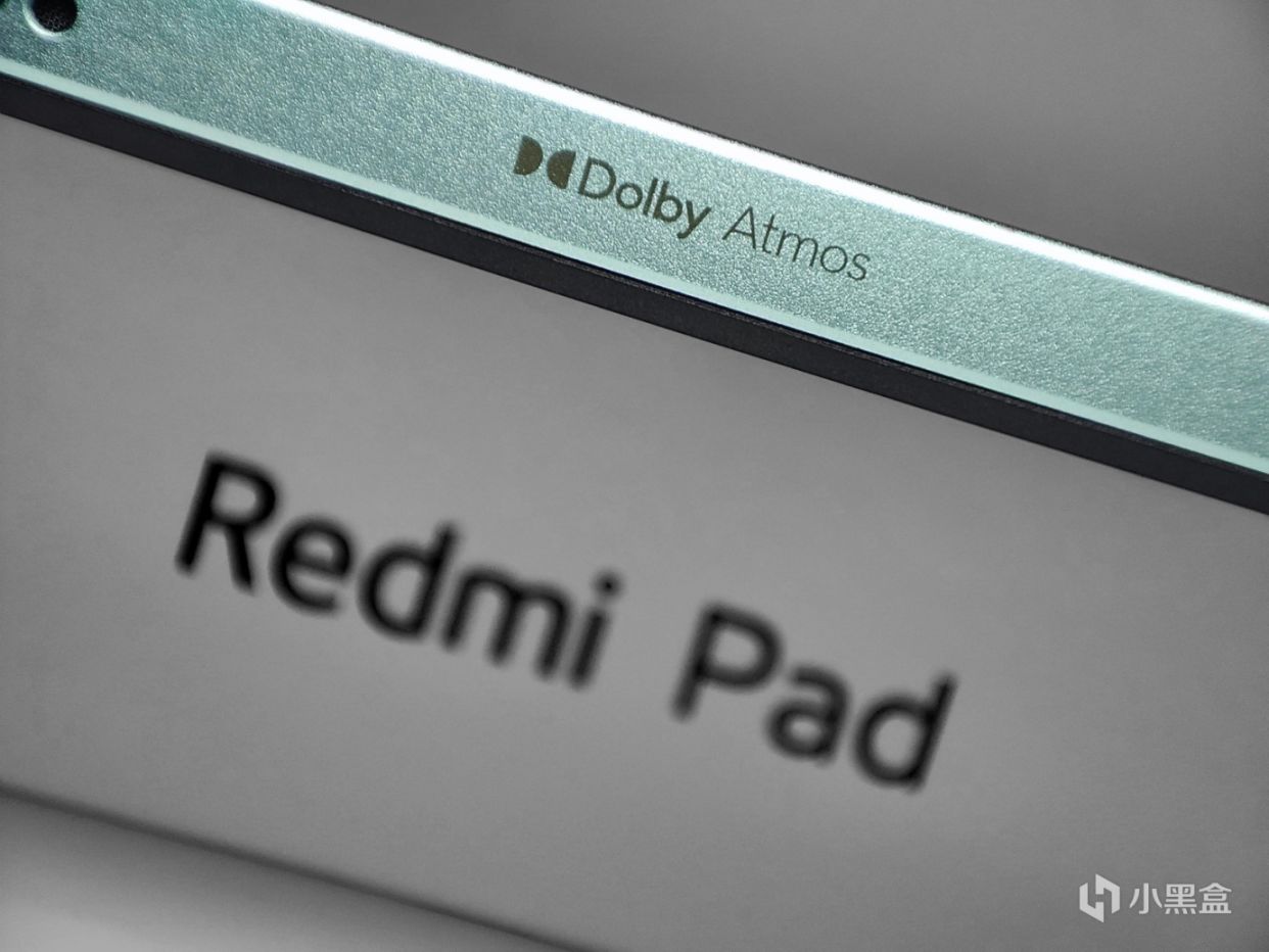 Redmi Pad包装盒整体为白色设计,正面产品主视觉图,比起真机略小了一圈,中间印着产品名称Redmi Pad,下方有杜比全景声Dolby Atmos认证Logo。