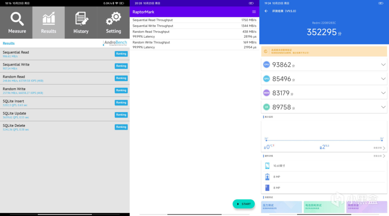 Androbench顺序读取986.61 MB/s,顺序写入907.14 MB/s,随机读取248.86 MB/s,随机写入248.86 MB/s。