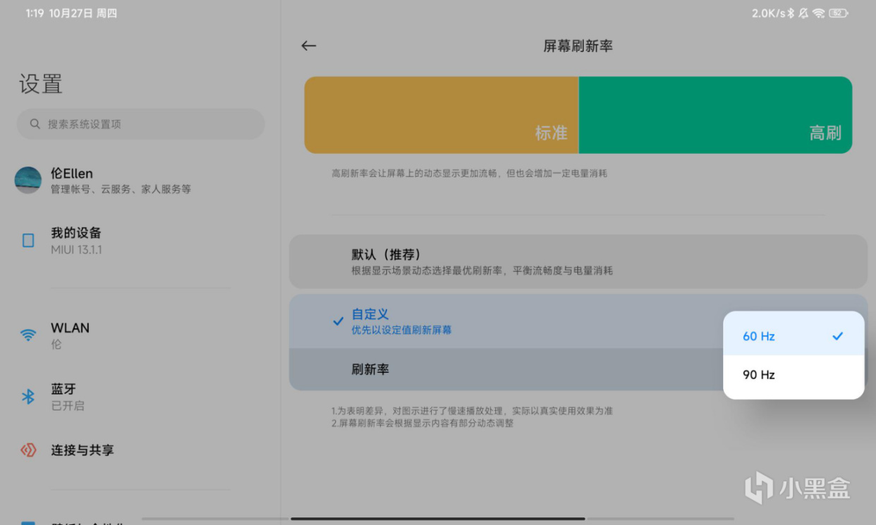 屏幕刷新率最高90Hz,可选默认动态选择分辨率或自定义60Hz / 90Hz两档。