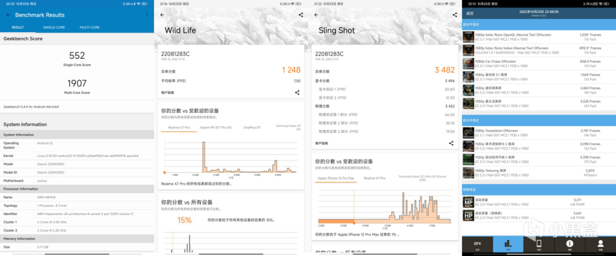 GPU部分,3D Mark Wild Life跑分1248,Sling Shot跑分3482。(骁龙680机型为447 / 2110)
