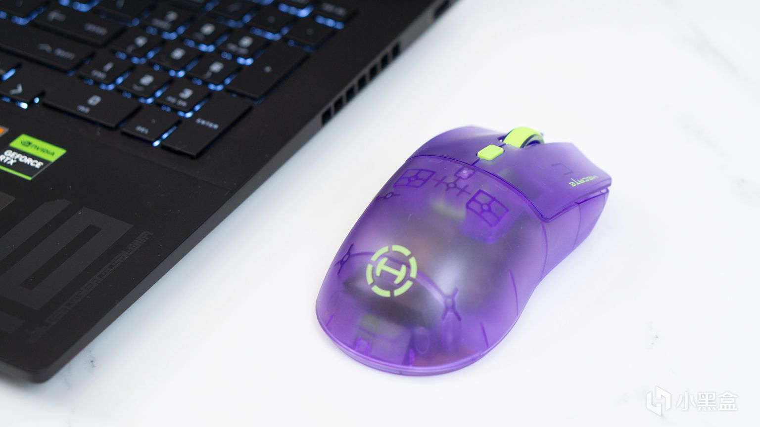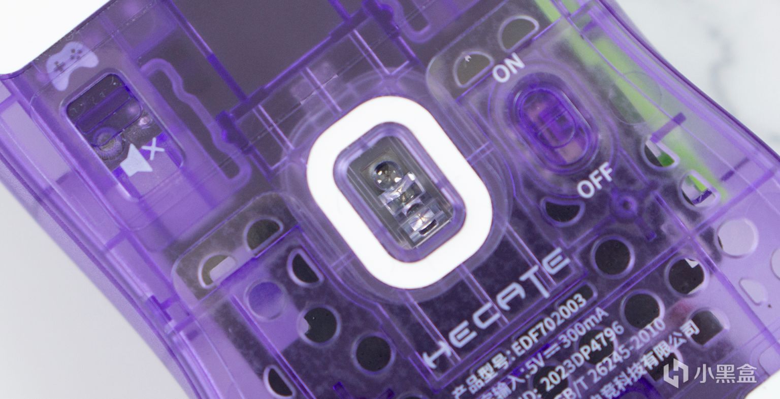 我接到的EVA配色的G3M PRO,它的主體爲半透明的紫色,其中的按鍵、品牌的LOGO等均爲熒光綠色,蠻好看的。