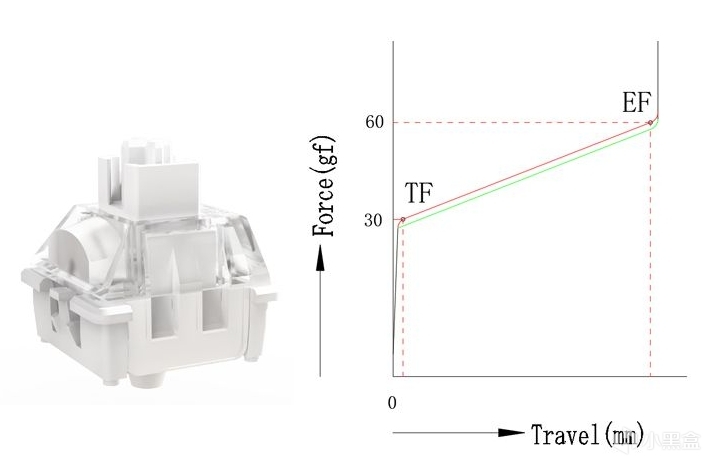 传统机械轴体的触发全靠内部金属弹片接触导电,整个过程是:按下-弹片合拢-触发,松开-弹片分开-停止。从按下到弹片接触的这段距离,就是我在评测里常说的轴体行程。