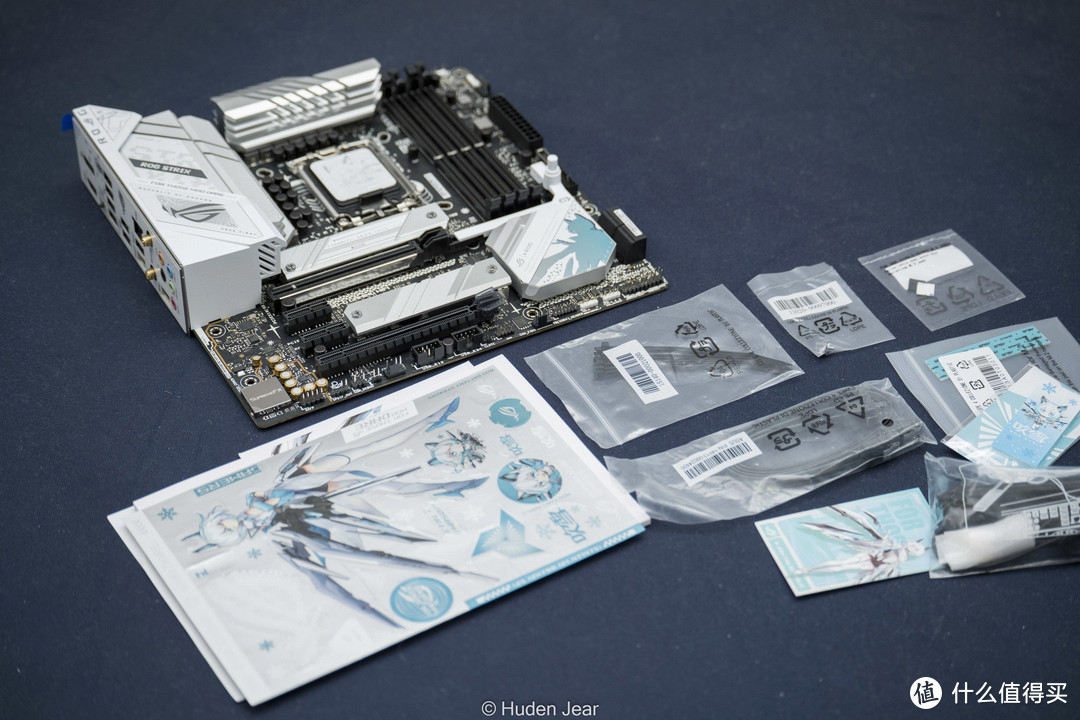 吹雪的包装和之前的STRIX风格区别很大, 从黑色变成了雪白,主板上的装饰变化也很明显。主板的配件也是比较标准的ROG TRSIX级别的,不算多但是很全