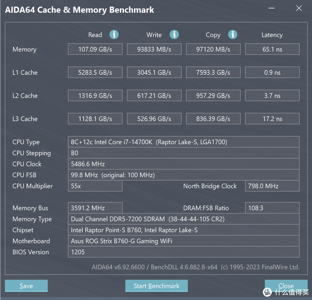 i7 14700K+STRIX B760-G小吹雪的内存支持非常不错,这次使用的是7200MHz的内存,直接XMP就能轻松开机,性能直接飙到了100GBps以上,畅爽